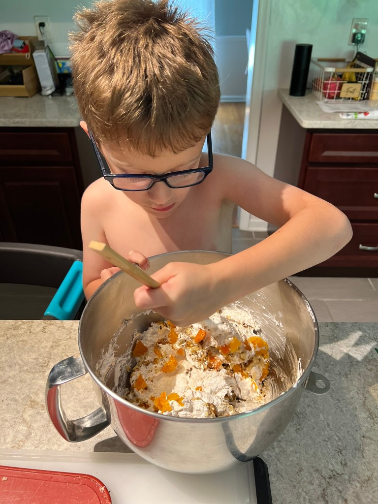 Back at home, we were ready to tackle our first recipe. The six year old meticulously diced the apricots, while the three year thoroughly enjoyed smashing the graham crackers. Everyone was mesmerized with the process of egg whites turning into stiff peaks!