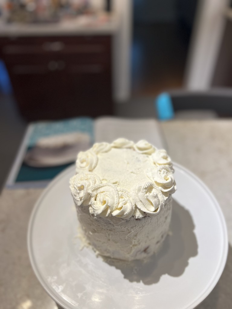 I desperately need to work on my decorating skills! Maybe my goal for next year is to take a cake decorating class. But I tried piping the whipped cream on as the author had done so with his version……mine’s definitely a bit rough.