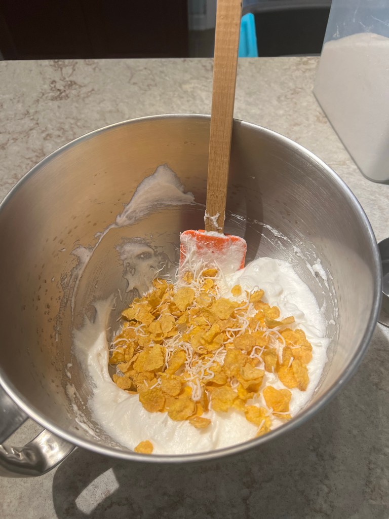 This was pretty simple to put together, egg whites, sugar, vanilla, cornflakes and coconut! I really do enjoy the simplicity of the meringue cookie, they’re light and chewy.
